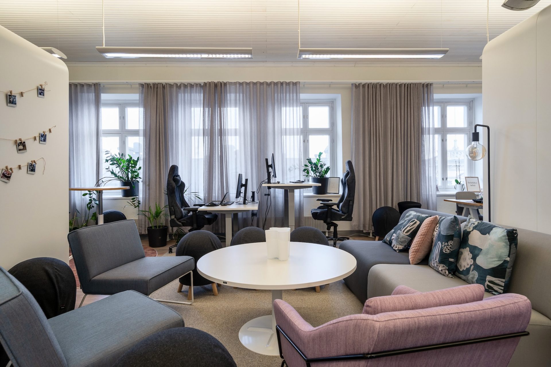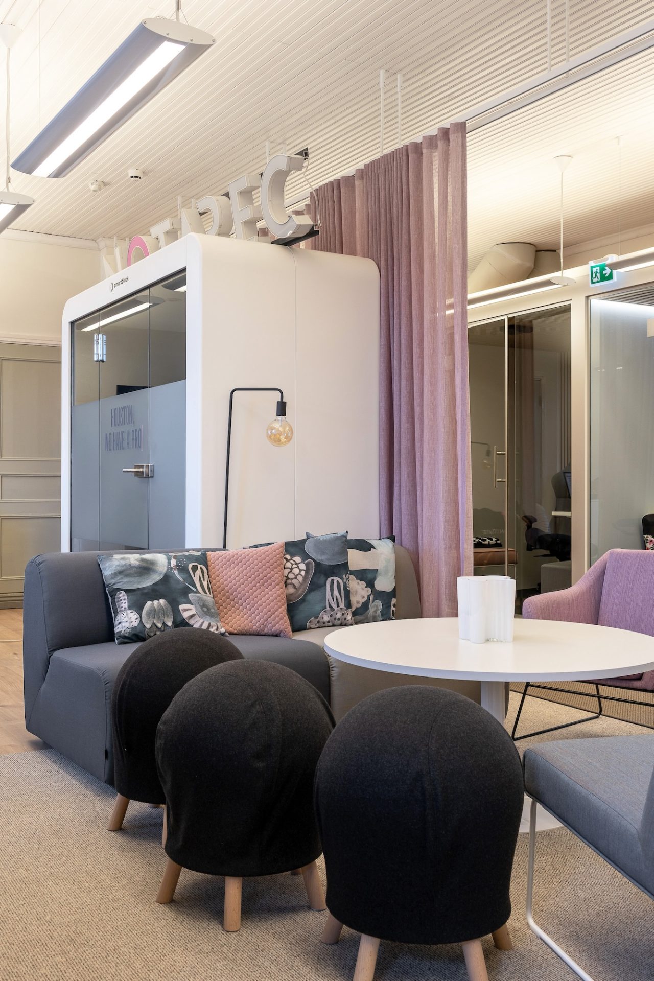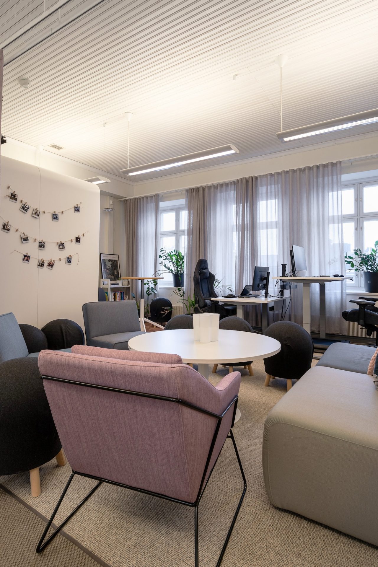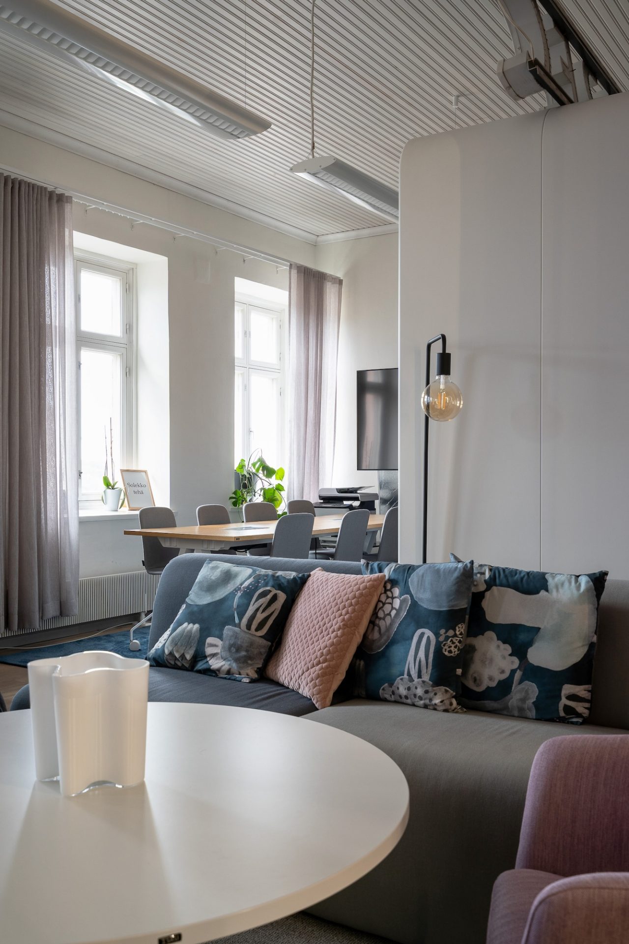 Tässä suunnittelussa toteutin toimitilan layoutin olemassa olevilla kalusteilla ja tekstiileillä, kun toimisto muutti noin 200 m² -> 80 m² toimitilaan.